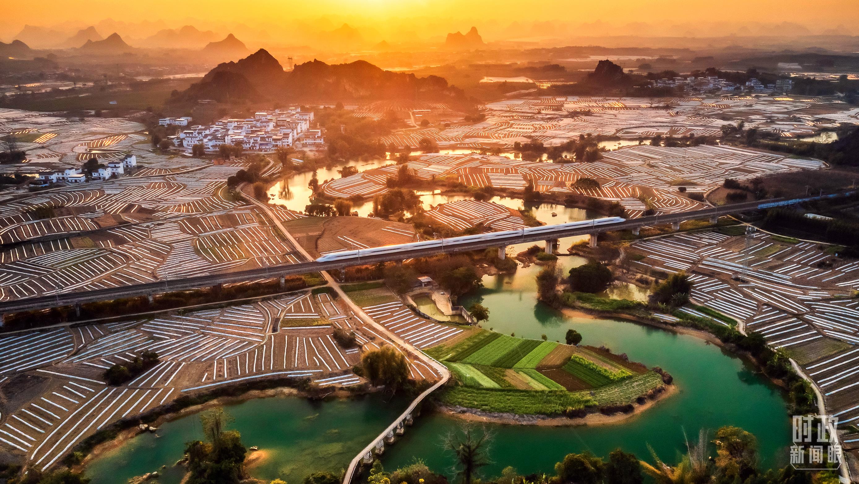 △2023年1月25日,农历春节期间,一辆高铁列车驶过南宁隆安县蔬果种植基地和新农村。